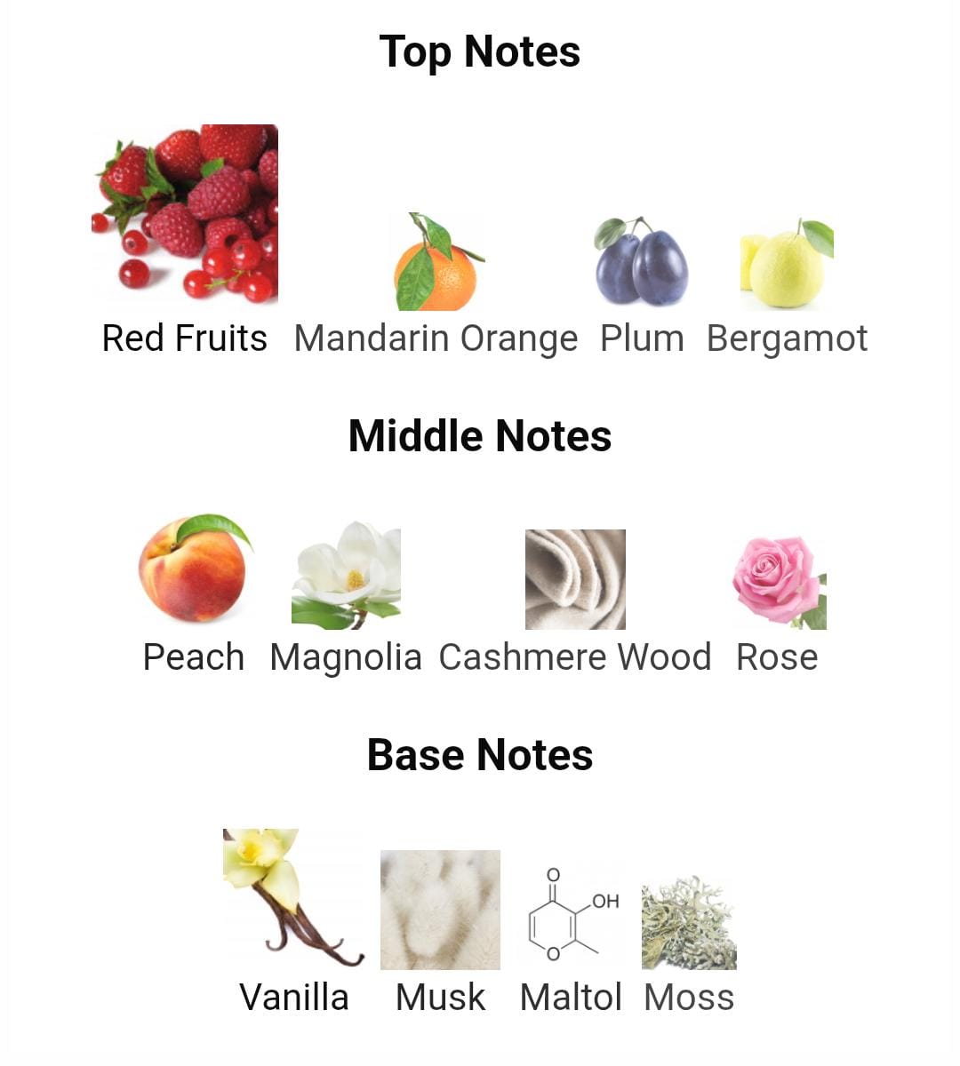 Base Notes: Bourbon Vanilla, Cashmeran, Guaiac Wood